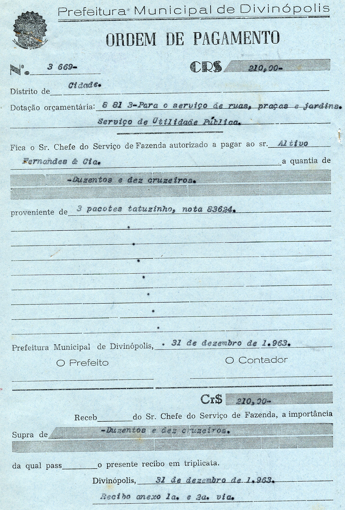 FICA O SR. CHEFE DO SERVIÇO DE FAZENDA AUTORIZADO A PAGAR AO SR. ALTIVO FERNANDES & CIA. A QUANTIA DE DUZENTOS E DEZ CRUZEIROS PROVENIENTE DE 03 PACOTES TATUZINHO.
