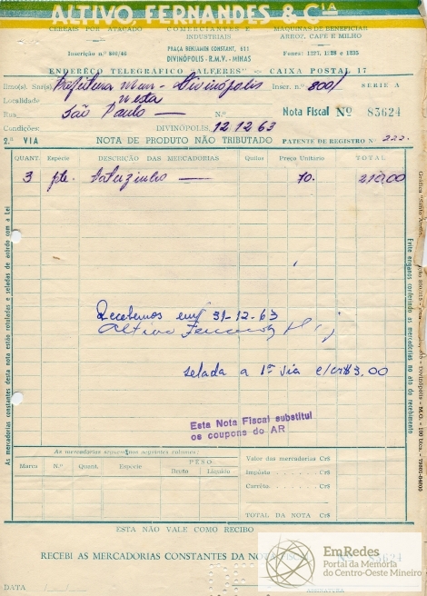 PREFEITURA MUNICIAPL DE DIVINÓPOLIS, 31 DE DEZEMBRO DE 1963.
