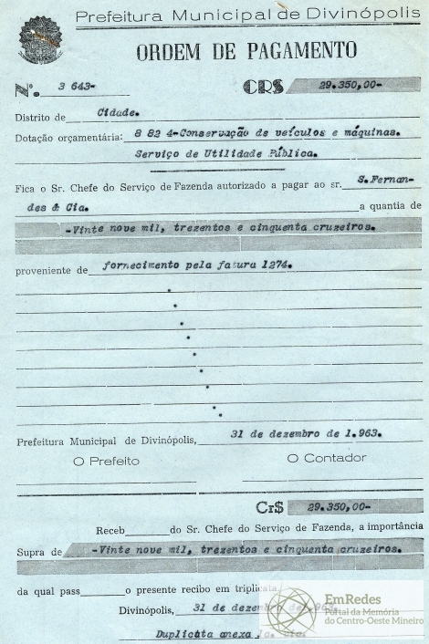 PREFEITURA MUNICIAPL DE DIVINÓPOLIS, 31 DE DEZEMBRO DE 1963.