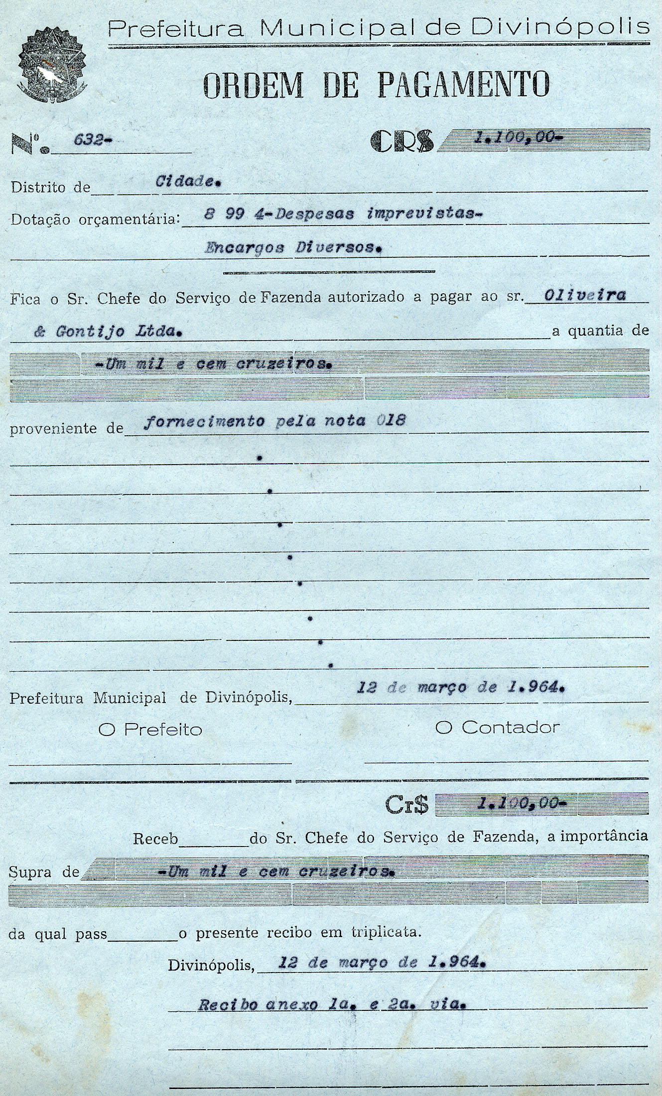 FICA O SR. CHEFE DO SERVIÇO DE FAZENDA AUTORIZADO A PAGAR AO SR. OLIVEIRA & GONTIJO LTDA. A QUANTIA DE UM MIL E CEM CRUZEIROS PROVENIENTE DE FORNECIMENTO.