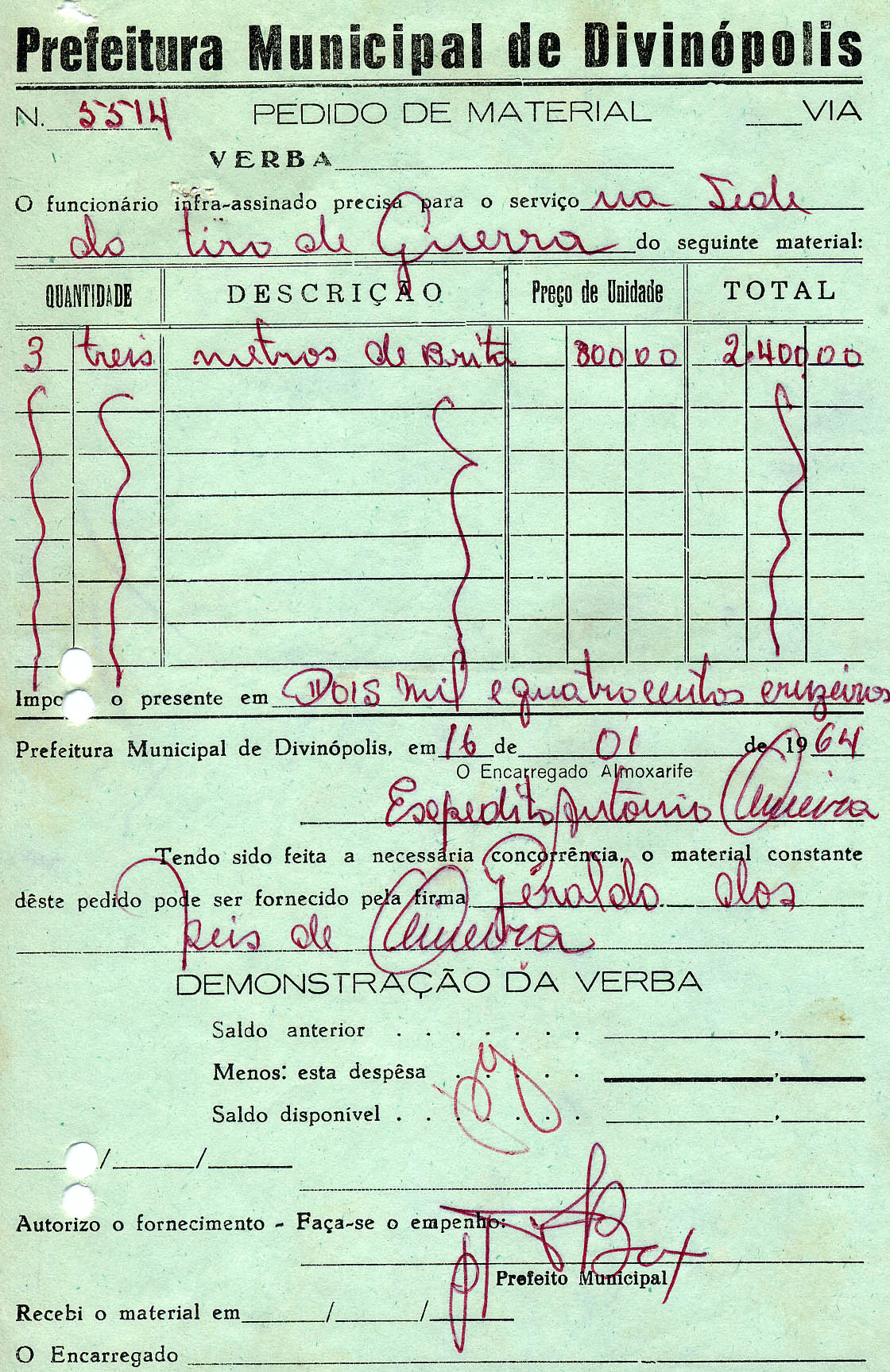 FICA O SR. CHEFE DO SERVIÇO DE FAZENDA AUTORIZADO A PAGAR AO SR. GERALDO DOS REIS DE OLIVEIRA A QUANTIA DE DOIS MIL E QUATROCENTOS CRUZEIROS PROVENIENTE DE FORNECIMENTO DE BRITA PARA O TIRO DE GUERRA.