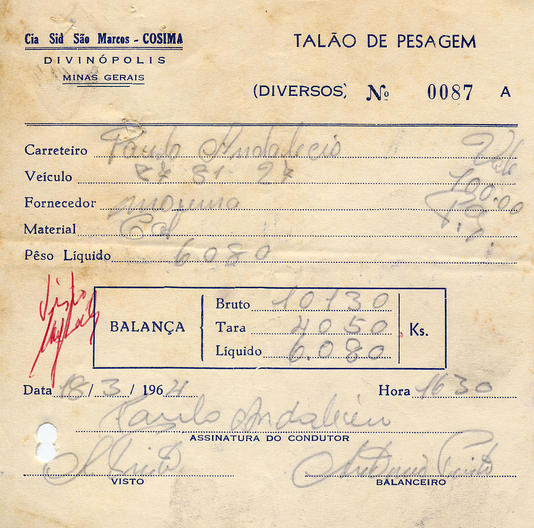 PREFEITURA MUNICIPAL DE DIVINÓPOLIS - ORDEM DE PAGAMENTO Nº 656 CR$ 66.880,00 DISTRITO DE CIDADE DOTAÇÃO ORÇAMENTÁRIA: 8-81-4 CONSTRUÇÃO E CONSERVAÇÃO DE LOGRADOUROS PÚBLICOS - SERVIÇO DE UTILIDADE PÚBLICA FICA O SR. CHEFE DO SERVIÇO DE FAZENDA AUTORIZADO A PAGAR AO SR. HÉLIO ANTÔNIO TIAGO A QUANTIA DE SESSENTA E SEIS MIL, OITOCENTOS E OITENTA CRUZEIROS PROVENIENTE DE FORNECIMENTO DE 6.080 KILOS DE CAL. PREFEITURA MUNICIPAL DE DIVINÓPOLIS, 23 DE MARÇO DE 1964. RECEBI DO SR. CHEFE DO SERVIÇO DE FAZENDA, A IMPORTÂNCIA SUPRA DE SESSENTA E SEIS MIL, OITOCENTOS E OITENTA CRUZEIROS DA QUAL PASSO O PRESENTE RECIBO EM TRIPLICATA. DIVINÓPOLIS, 23 DE MARÇO DE 1964.