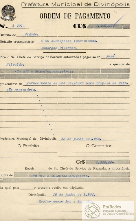 PREFEITURA MUNICIPAL DE DIVINÓPOLIS, 18 DE JUNHO DE 1964.
