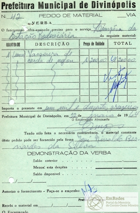 PREFEITURA MUNICIPAL DE DIVINÓPOLIS- ORDEM DE PAGAMENTO Nº 1791 CR$ 1.200,00 DISTRITO DE CIDADE DOTAÇÃO ORÇAMENTÁRIA: 8-99-4 DESPESAS IMPREVISTAS, ENCARGOS DIVERSOS FICA O SR. CHEFE DO SERVIÇO DE FAZENDA AUTORIZADO A PAGAR AO SR. JOSÉ NILVALDO A QUANTIA DE UM MIL E DUZENTOS CRUZEIROS PROVENIENTE DE FORNECIMENTO DE UMA VASSOURA PARA LIMPEZA DA ESTAÇÃO RODOVIÁRIA. PREFEITURA MUNICIPAL DE DIVINÓPOLIS, 18 DE JUNHO DE 1964. RECEBI DO SR. CHEFE DO SERVIÇO DE FAZENDA, A IMPORTÂNCIA SUPRA DE UM MIL E DUZENTOS CRUZEIROS DA QUAL PASSO O PRESENTE RECIBO EM TRIPLICATA. DIVINÓPOLIS, 18 DE JUNHO 1964.