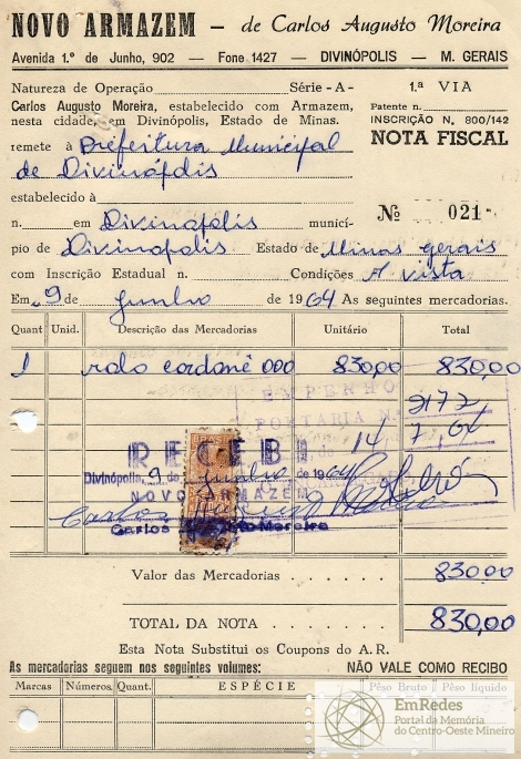 PREFEITURA MUNICIPAL DE DIVINÓPOLIS, 14 DE JULHO DE 1964.