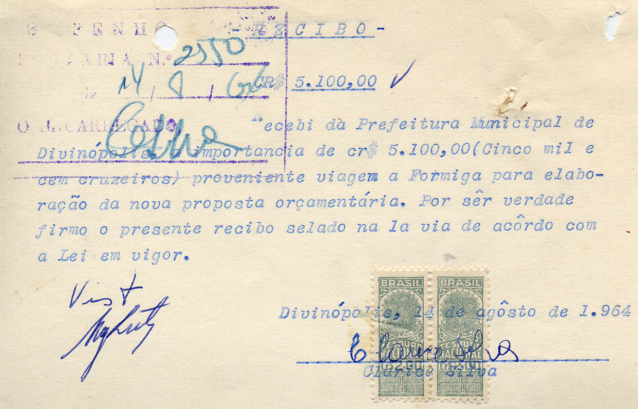 RECEBI DO SR. CHEFE DO SERVIÇO DE FAZENDA, A IMPORTÂNCIA SUPRA DE CINCO MIL E CEM CRUZEIROS DA QUAL PASSO O PRESENTE RECIBO EM TRIPLICATA.