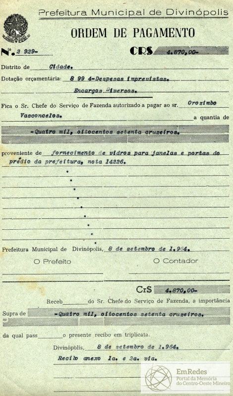 FICA O SR. CHEFE DO SERVIÇO DE FAZENDA AUTORIZADO A PAGAR AO SR.OROZIMBO VASCONCELOS A QUANTIA DE QUATRO MIL, OITOCENTOS E SETENTA CRUZEIROS PROVENIENTE DE FORNECIMENTO DE VIDROS PARA JANELAS E PORTAS DO PRÉDIO DA PREFEITURA.