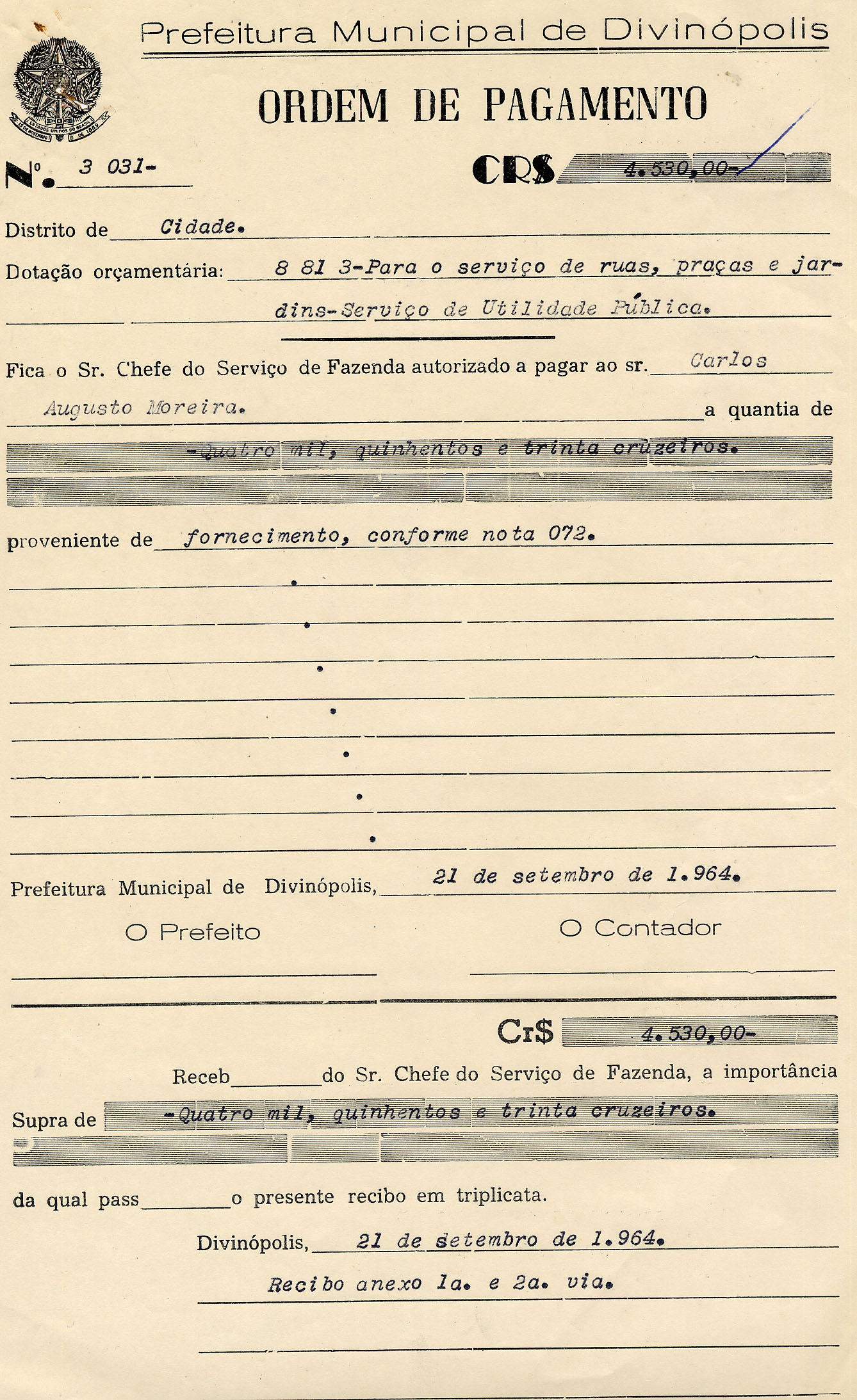 RECEBI DO SR. CHEFE DO SERVIÇO DE FAZENDA, A IMPORTÂNCIA SUPRA DE QUATRO MIL, QUINHENTOS E TRINTA CRUZEIROS DA QUAL PASSO O PRESENTE RECIBO EM TRIPLICATA.