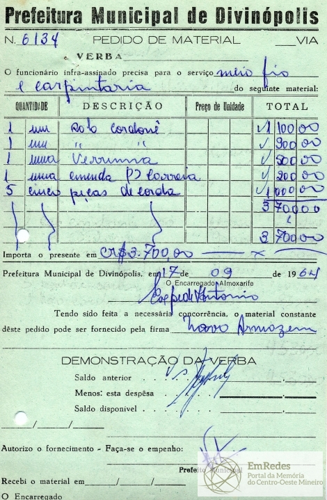 PREFEITURA MUNICIPAL DE DIVINÓPOLIS, 21 DE SETEMBRO DE 1964.