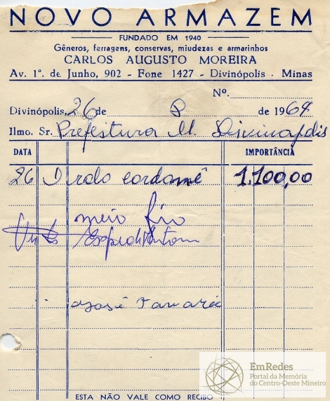 PREFEITURA MUNICIPAL DE DIVINÓPOLIS- ORDEM DE PAGAMENTO Nº 3031 CR$ 4.530,00 DISTRITO DE CIDADE DOTAÇÃO ORÇAMENTÁRIA: 8-81-3 SERVIÇO DE RUAS, PRAÇAS E JARDINS - SERVIÇO DE UTILIDADE PÚBLICA FICA O SR. CHEFE DO SERVIÇO DE FAZENDA AUTORIZADO A PAGAR AO SR. CARLOS AUGUSTO MOREIRA A QUANTIA DE QUATRO MIL, QUINHENTOS E TRINTA CRUZEIROS PROVENIENTE DE FORNECIMENTO. PREFEITURA MUNICIPAL DE DIVINÓPOLIS, 21 DE SETEMBRO DE 1964. RECEBI DO SR. CHEFE DO SERVIÇO DE FAZENDA, A IMPORTÂNCIA SUPRA DE QUATRO MIL, QUINHENTOS E TRINTA CRUZEIROS DA QUAL PASSO O PRESENTE RECIBO EM TRIPLICATA. DIVINÓPOLIS, 21 DE SETEMBRO DE 1964.