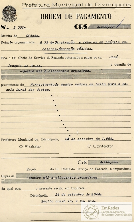 RECEBI DO SR. CHEFE DO SERVIÇO DE FAZENDA, A IMPORTÂNCIA SUPRA DE QUATRO MIL E OITOCENTOS CRUZEIROS DA QUAL PASSO O PRESENTE RECIBO EM TRIPLICATA.