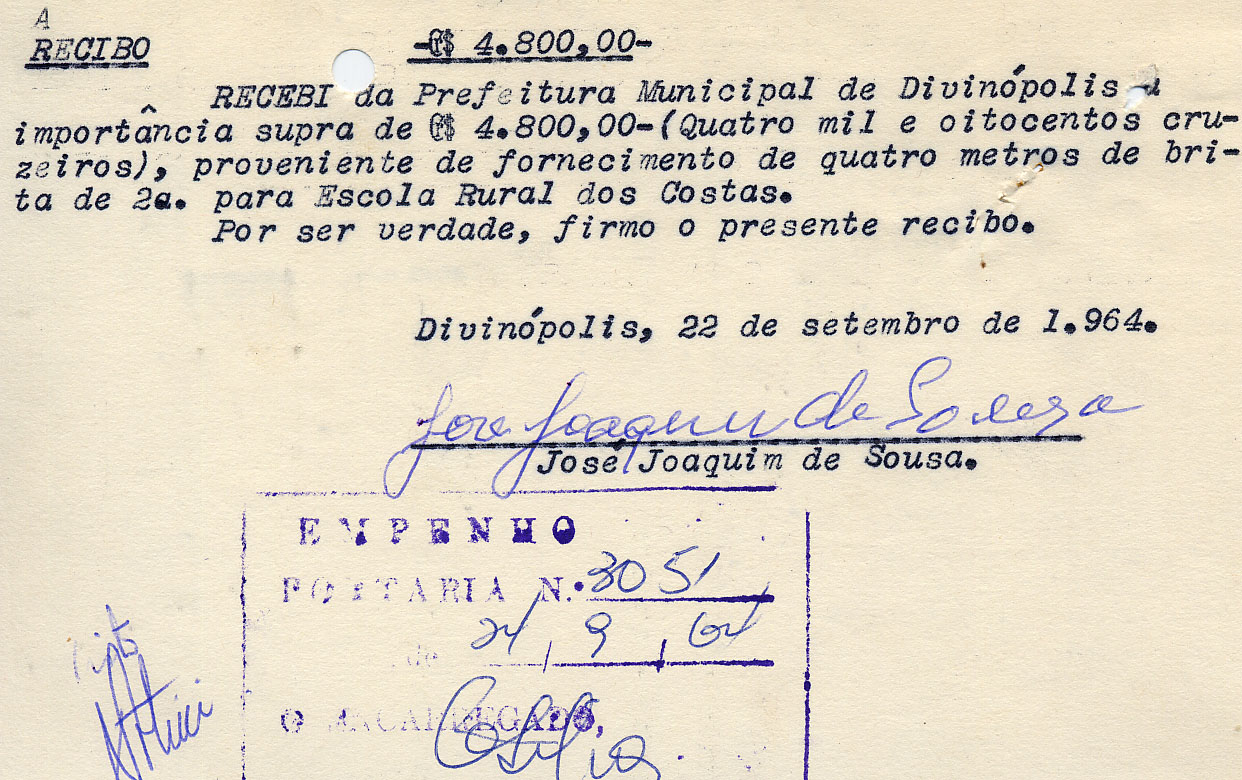 RECEBI DO SR. CHEFE DO SERVIÇO DE FAZENDA, A IMPORTÂNCIA SUPRA DE QUATRO MIL E OITOCENTOS CRUZEIROS DA QUAL PASSO O PRESENTE RECIBO EM TRIPLICATA.