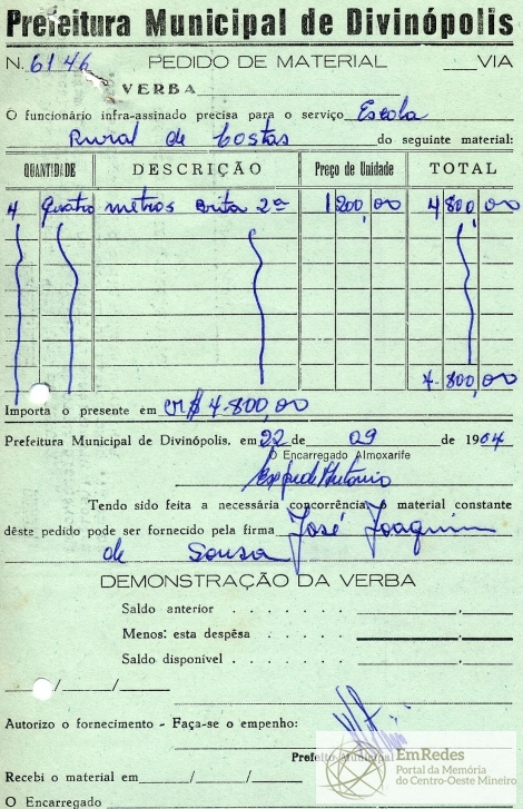 FICA O SR. CHEFE DO SERVIÇO DE FAZENDA AUTORIZADO A PAGAR AO SR.JOSÉ JOAQUIM DE SOUSA A QUANTIA DE QUATRO MIL E OITOCENTOS CRUZEIROS PROVENIENTE DE FORNECIMENTO DE BRITA.
