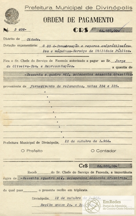 PREFEITURA MUNICIPAL DE DIVINÓPOLIS, 12 DE OUTUBRO DE 1964.