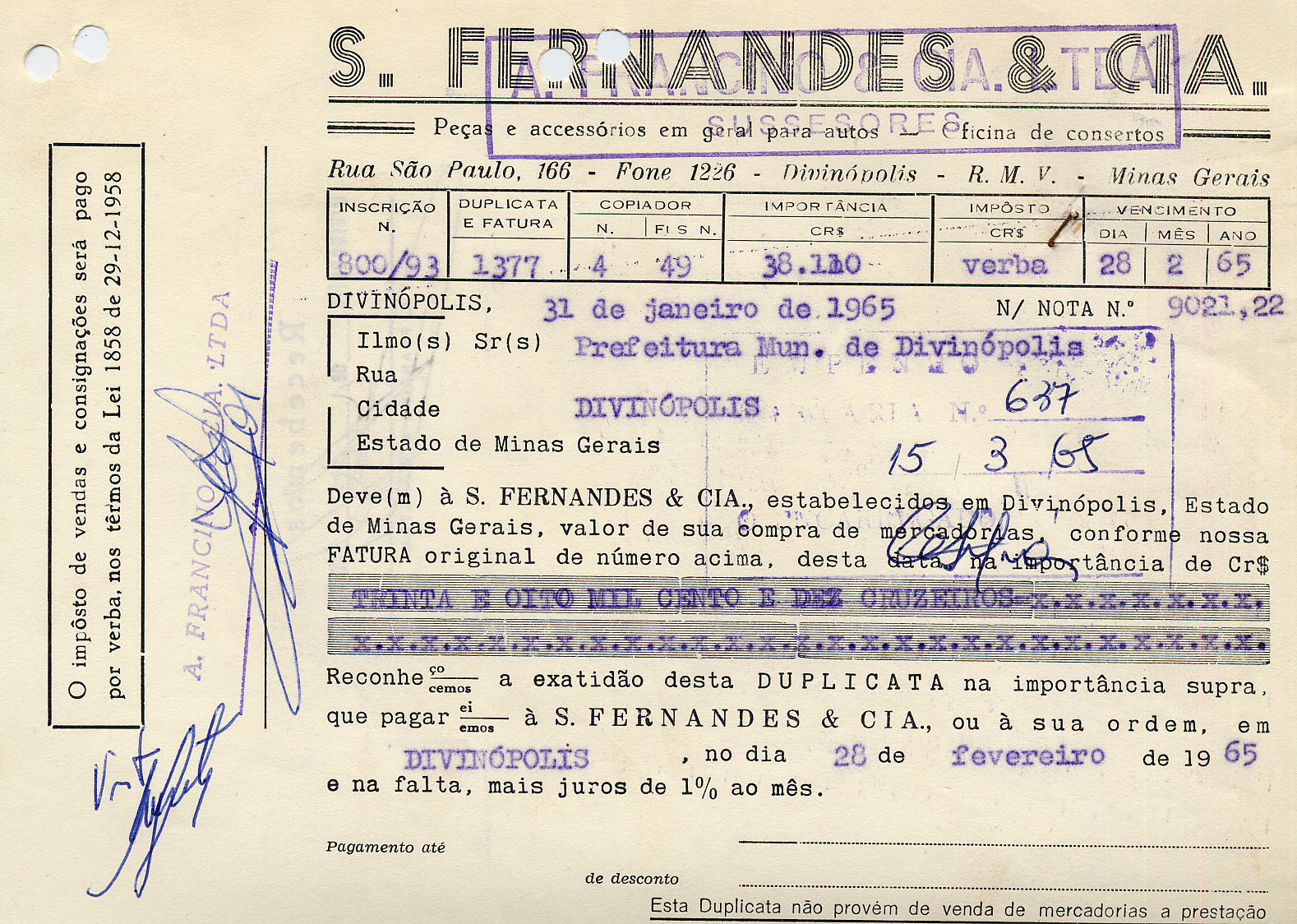 PREFEITURA MUNICIPAL DE DIVINÓPOLIS- ORDEM DE PAGAMENTO Nº 637 CR$ 38.110,00 DISTRITO DE CIDADE DOTAÇÃO ORÇAMENTÁRIA:3-1-4-0-96 CONSERVAÇÃO DE VEÍCULOS E FERRAMENTAS - HABITAÇÃO E SERVIÇOS URBANOS. FICA O SR. CHEFE DO SERVIÇO DE FAZENDA AUTORIZADO A PAGAR AO SR.A. FRANCINO & CIA. LTDA. A QUANTIA DE TRINTA E OITO MIL, CENTO E DEZ CRUZEIROS PROVENIENTE DE FORNECIMENTO. PREFEITURA MUNICIPAL DE DIVINÓPOLIS, 15 DE MARÇO DE 1965. RECEBI DO SR. CHEFE DO SERVIÇO DE FAZENDA A IMPORTÂNCIA SUPRA DE TRINTA E OITO MIL, CENTO E DEZ CRUZEIROS DA QUAL PASSO O PRESENTE RECIBO EM TRIPLICATA. DIVINÓPOLIS, 15 DE MARÇO DE 1965.