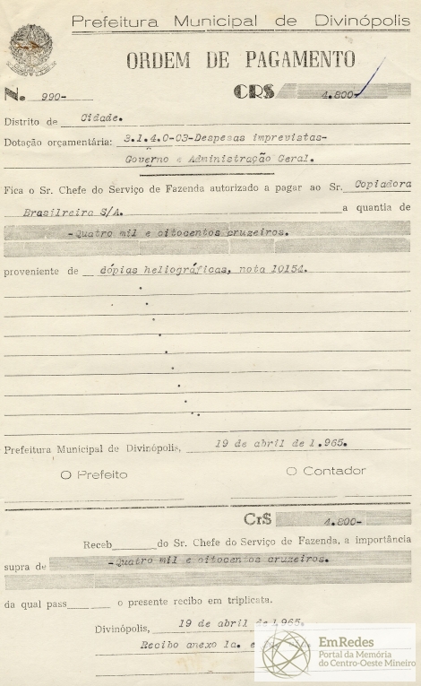 RECEBI DO SR. CHEFE DO SERVIÇO DE FAZENDA A IMPORTÂNCIA SUPRA DE QUATRO MIL E OITOCENTOS CRUZEIROS DA QUAL PASSO O PRESENTE RECIBO EM TRIPLICATA.