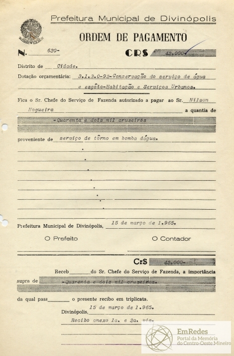 PREFEITURA MUNICIPAL DE DIVINÓPOLIS, 15 DE MARÇO DE 1965.