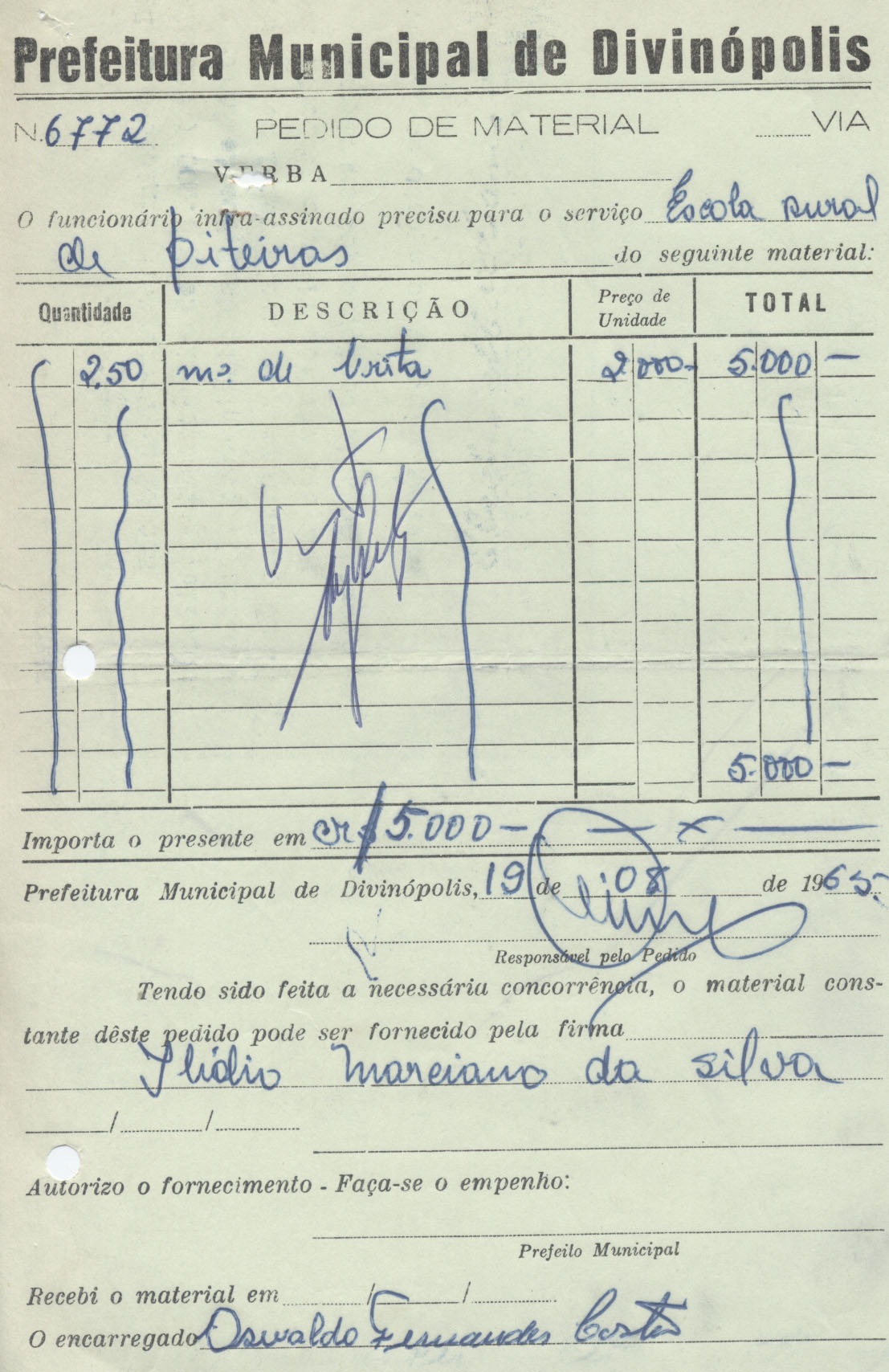 FICA O SR. CHEFE DO SERVIÇO DE FAZENDA AUTORIZADO A PAGAR AO SR.ILÍDIO MARCIANO DA SILVA A QUANTIA DE CINCO MIL CRUZEIROS PROVENIENTE DE FORNECIMENTO DE BRITA PARA CONSTRUÇÃO DE ESCOLA RURAL.