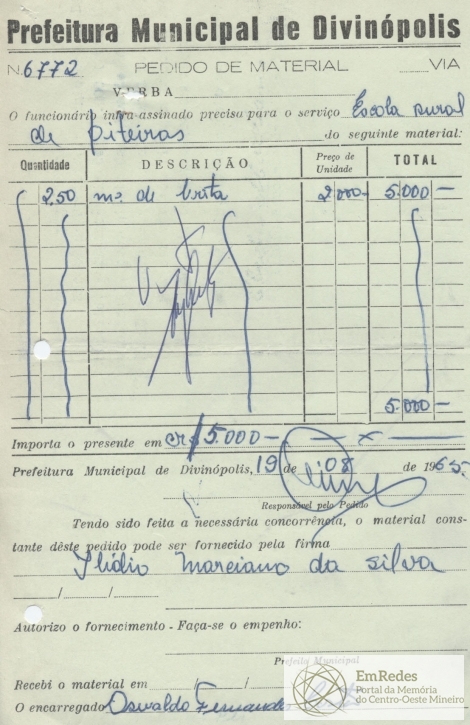 PREFEITURA MUNICIPAL DE DIVINÓPOLIS, 20 DE AGOSTO DE 1965.