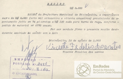 RECEBI DO SR. CHEFE DO SERVIÇO DE FAZENDA A IMPORTÂNCIA SUPRA DE OITO MIL, OITOCENTOS E OINTENTA CRUZEIROS DA QUAL PASSO O PRESENTE RECIBO EM TRIPLICATA.