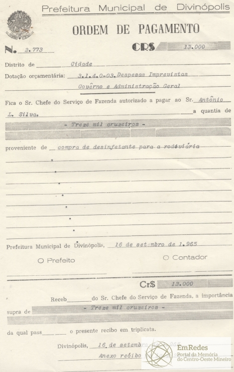 PREFEITURA MUNICIPAL DE DIVINÓPOLIS, 16 DE SETEMBRO DE 1965.