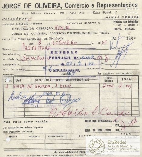 FICA O SR. CHEFE DO SERVIÇO DE FAZENDA AUTORIZADO A PAGAR AO SR.JORGE DE OLIVEIRA COMÉRCIO E REPRESENTAÇÕES A QUANTIA DE DOIS MIL CRUZEIROS PROVENIENTE DE FORNECIMENTO DE 01 LATA DE GRAXA.