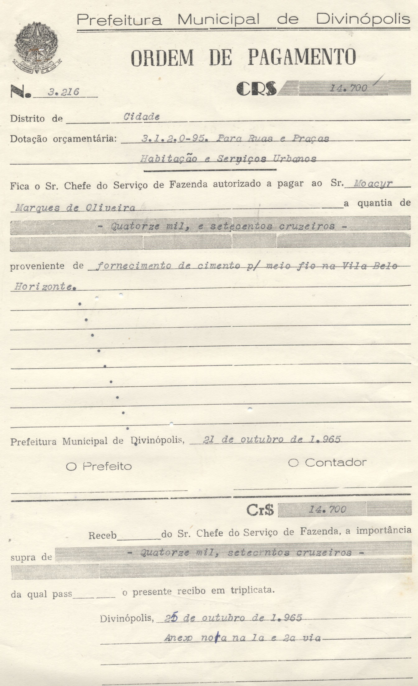 PREFEITURA MUNICIPAL DE DIVINÓPOLIS, 21 DE OUTUBRO DE 1965.