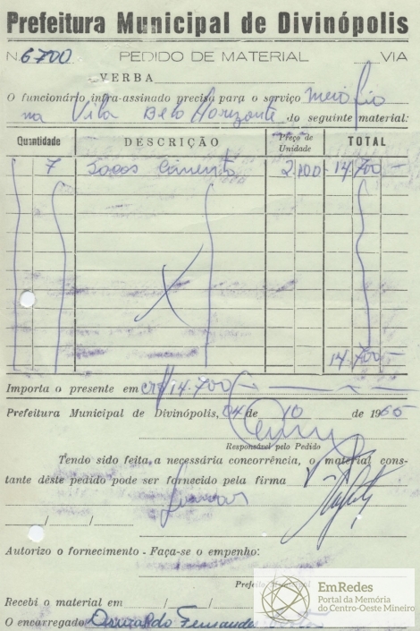 FICA O SR. CHEFE DO SERVIÇO DE FAZENDA AUTORIZADO A PAGAR AO SR.MOACYR MARQUES DE OLIVEIRA A QUANTIA DE QUATORZE MIL E SETECENTOS CRUZEIROS PROVENIENTE DE FORNECIMENTO DE CIMENTO PARA MEIO FIO NA VILA BELO HORIZONTE.
