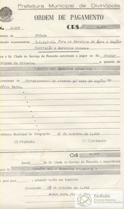 FICA O SR. CHEFE DO SERVIÇO DE FAZENDA AUTORIZADO A PAGAR AO SR. MOACYR MARQUES DE OLIVEIRA A QUANTIA DE QUATRO MIL E DUZENTOS CRUZEIROS PROVENIENTE DE FORNECIMENTO DE CIMENTO PARA REDE DE ESGOTO NO PORTO VELHO.