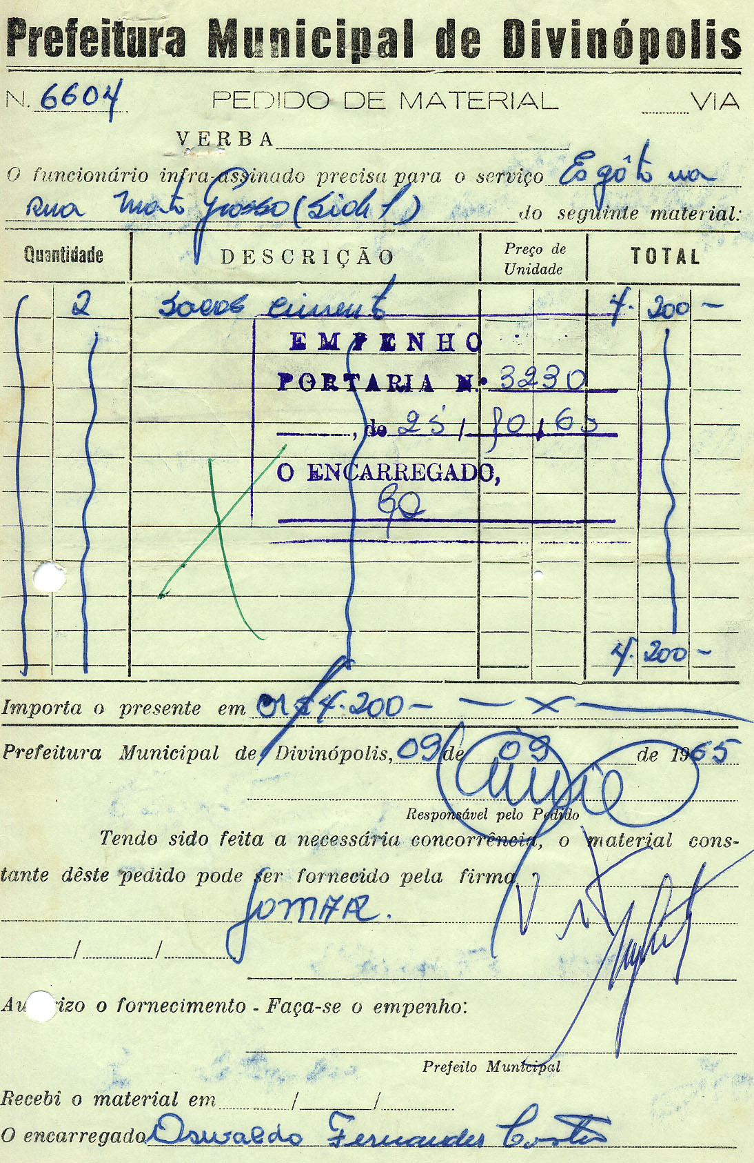 FICA O SR. CHEFE DO SERVIÇO DE FAZENDA AUTORIZADO A PAGAR AO SR. MOACYR MARQUES DE OLIVEIRA A QUANTIA DE QUATRO MIL E DUZENTOS CRUZEIROS PROVENIENTE DE FORNECIMENTO DE CIMENTO PARA REDE DE ESGOTO.
