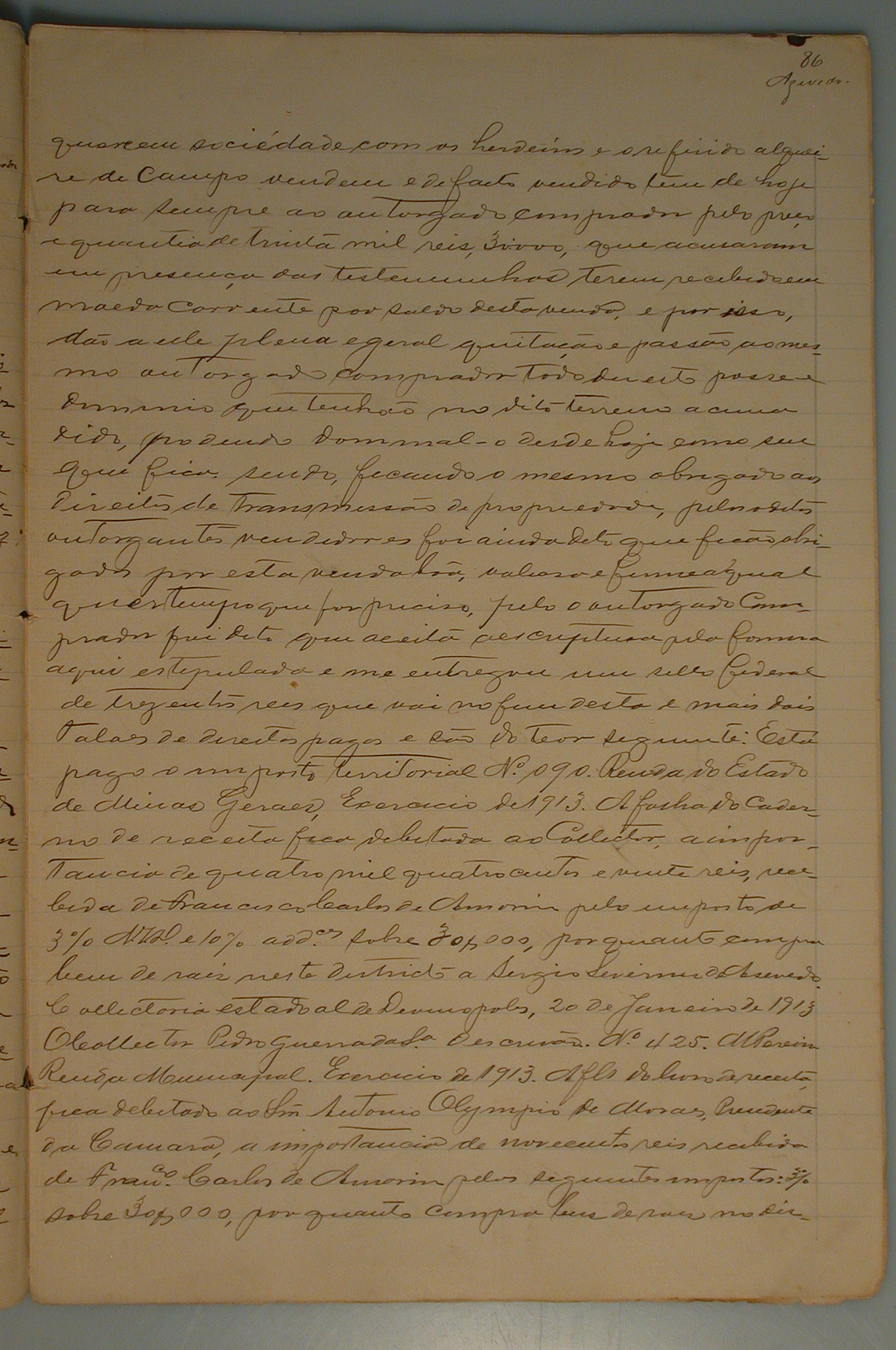 ESCRITURA PÚBLICA DE COMPRA E VENDA DE BENS DE RAIZ QUE FAZEM SÉRGIO SEVERINO DE AZEVEDO A FRANCISCO CARLOS DE AMORIM, A VENDA DE 1 ALQUEIRE DE CAMPO NO LUGAR DENOMINADO VARGEM DO CÓRREGO DO CARIOCA, PELO PREÇO DE 30 MIL REIS.