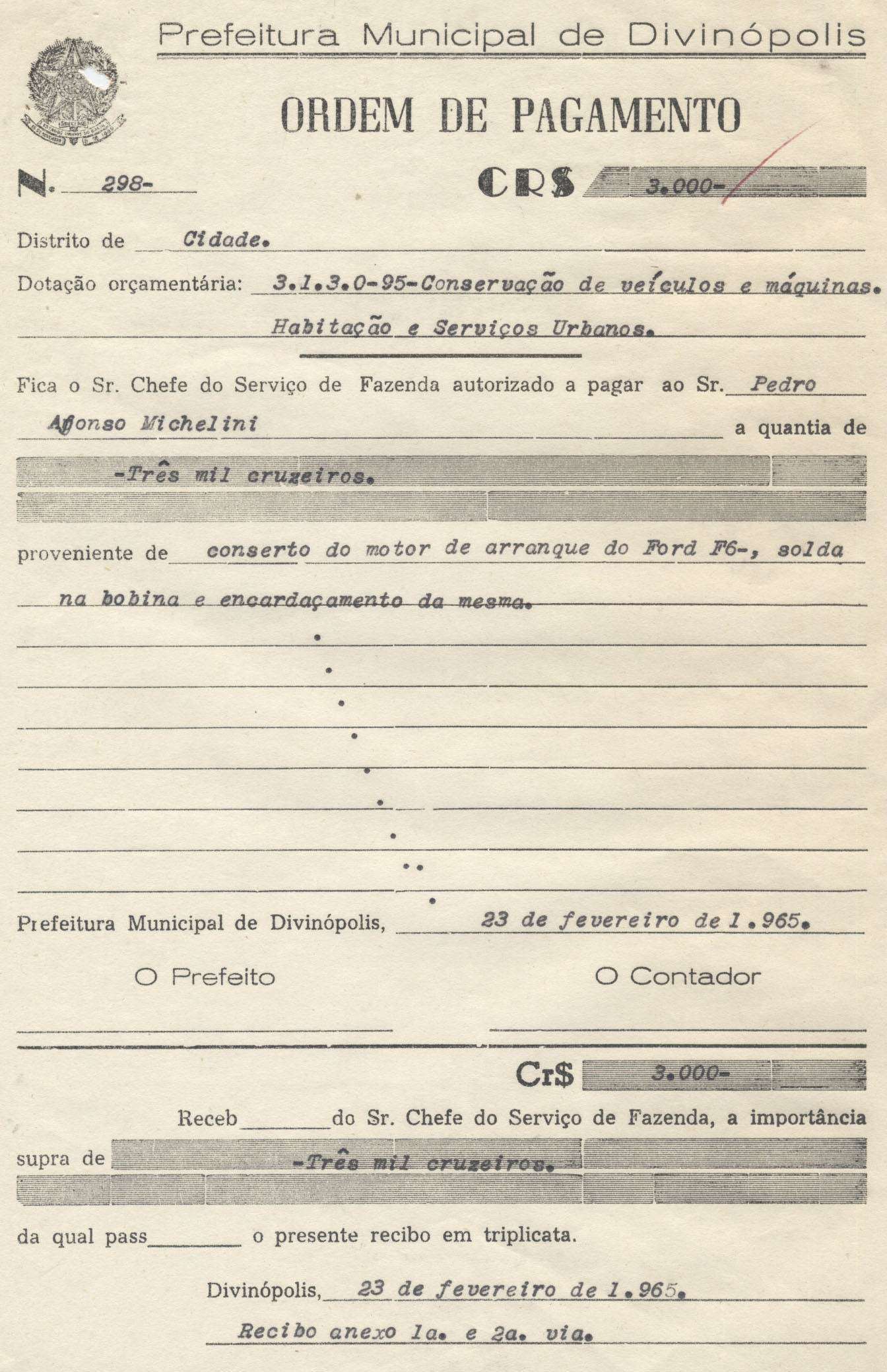 FICA O SR. CHEFE DO SERVIÇO DE FAZENDA AUTORIZADO A PAGAR AO SR. PEDRO AFONSO MICHELINI A QUANTIA DE TRÊS MIL CRUZEIROS PROVENIENTE DE CONSERTO DO MOTOR DE ARRANQUE DO FORD, SOLDA NA BOBINA E ENCARDAÇAMENTO DA MESMA.