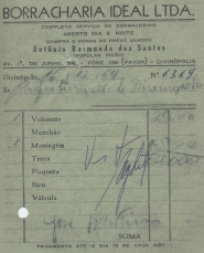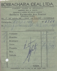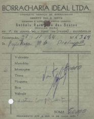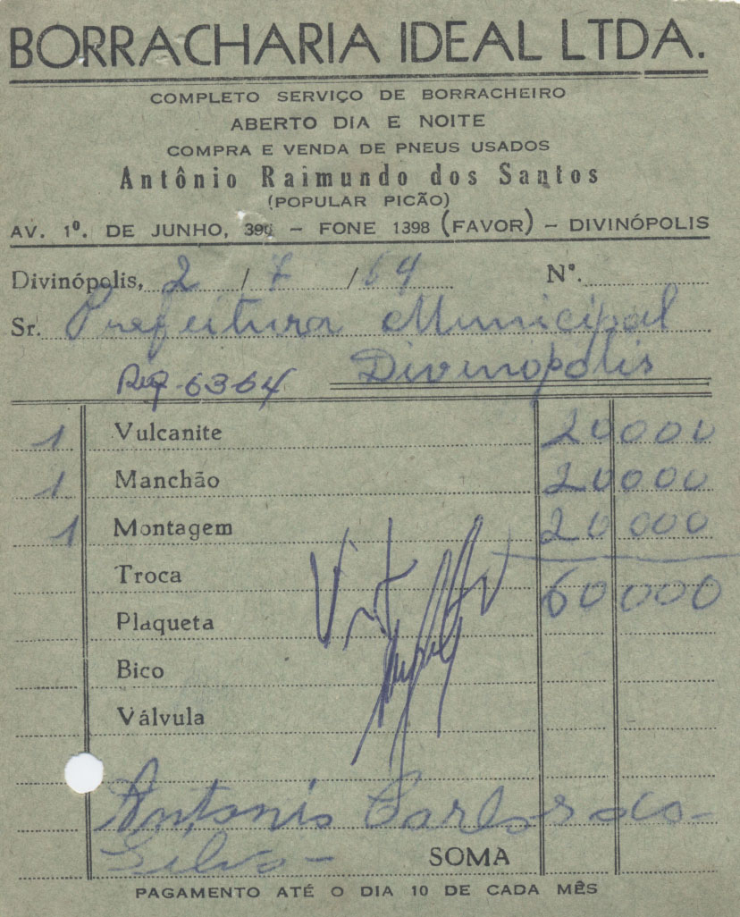 PREFEITURA MUNICIPAL DE DIVINÓPOLIS - ORDEM DE PAGAMENTO Nº 334 CR$ 6.650,00 DISTRITO DE CIDADE DOTAÇÃO ORÇAMENTÁRIA: 3-1-3-0-95 CONSERVAÇÃO DE VEÍCULOS E MÁQUINAS - HABITAÇÃO E SERVIÇOS URBANOS FICA O SR. CHEFE DO SERVIÇO DE FAZENDA AUTORIZADO A PAGAR AO SR. BORRACHARIA IDEAL LTDA. A QUANTIA DE SEIS MIL, SEISCENTOS E CINQUENTA CRUZEIROS PROVENIENTE DE SERVIÇO DE VULCANITE. PREFEITURA MUNICIPAL DE DIVINÓPOLIS, 25 DE FEVEREIRO DE 1965. RECEBI DP SR. CHEFE DO SERVIÇO DE FAZENDA A IMPORTÂNCIA SUPRA DE SEIS MIL, SEISCENTOS E CINQUENTA CRUZEIROS DA QUAL PASSO O PRESENTE RECIBO EM TRIPLICATA. DIVINÓPOLIS, 25 DE FEVEREIRO DE 1965.