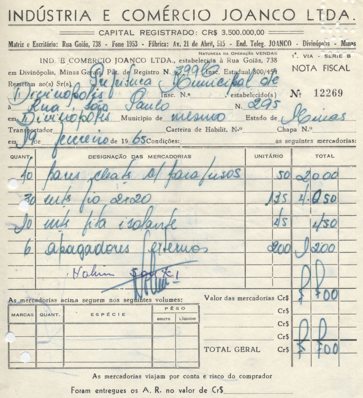 FICA O SR. CHEFE DO SERVIÇO DE FAZENDA AUTORIZADO A PAGAR AO SR. INDÚSTRIA E COMÉRCIO JOANCO LTDA. A QUANTIA DE DEZENOVE MIL E QUATROCENTOS CRUZEIROS PROVENIENTE DE FORNECIMENTO DE MATERIAL PARA INSTALAÇÃO ELÉTRICA NOS GRUPOS.