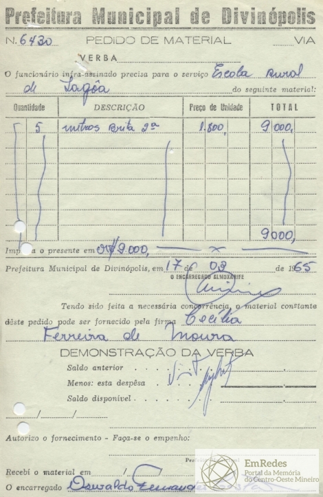 FICA O SR. CHEFE DO SERVIÇO DE FAZENDA AUTORIZADO A PAGAR AO SR. CECÍLIA FERREIRA DE MOURA A QUANTIA DE NOVE MIL CRUZEIROS PROVENIENTE DE BRITA DE 2ª PARA ESCOLA RURAL.