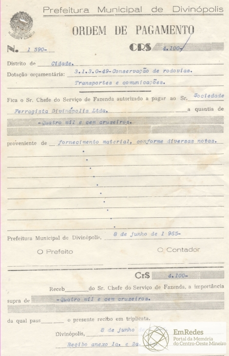 PREFEITURA MUNICIPAL DE DIVINÓPOLIS, 08 DE JUNHO DE 1965.