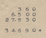 RECEBI DO SR. CHEFE DO SERVIÇO DE FAZENDA A IMPORTÂNCIA SUPRA DE TRINTA E QUATRO MIL, SEISCENTOS E NOVENTA CRUZEIROS DA QUAL PASSO O PRESENTE RECIBO EM TRIPLICATA.