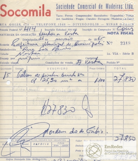 PREFEITURA MUNICIPAL DE DIVINÓPOLIS, 15 DE JUNHO DE 1965.