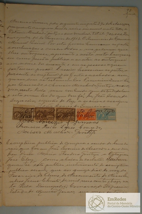 ESCRITURA PÚBLICA DE COMPRA E VENDA DE BENS DE RAIZ QUE FAZEM MARIA THEODORA GONTIJO A OCTAVIANO JOSE ELOY, A VENDA DE PARTES DE UMA CASA, NA RUA ESPIRITO SANTO PELO PREÇO DE 350 MIL REIS.