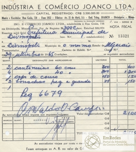 PREFEITURA MUNICIPAL DE DIVINÓPOLIS, 08 DE OUTUBRO DE 1965.