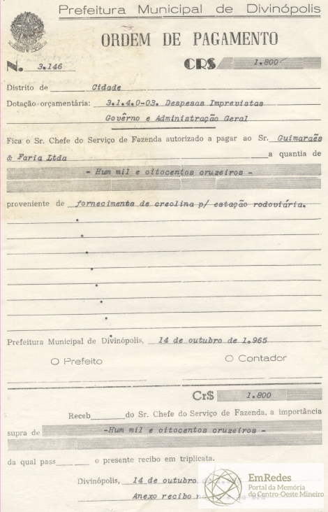 PREFEITURA MUNICIPAL DE DIVINÓPOLIS, 14 DE OUTUBRO DE 1965.