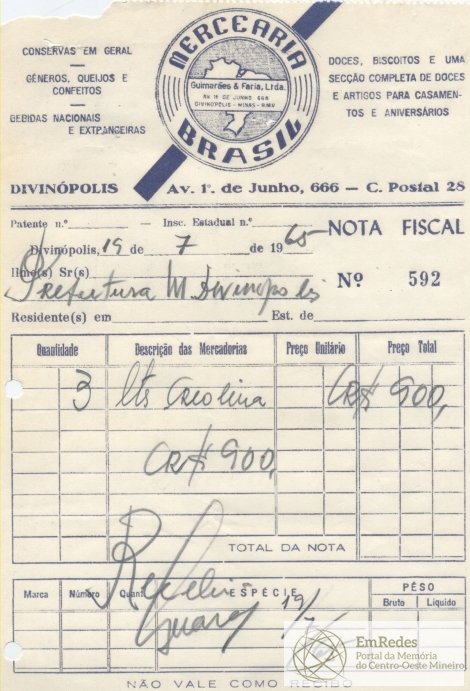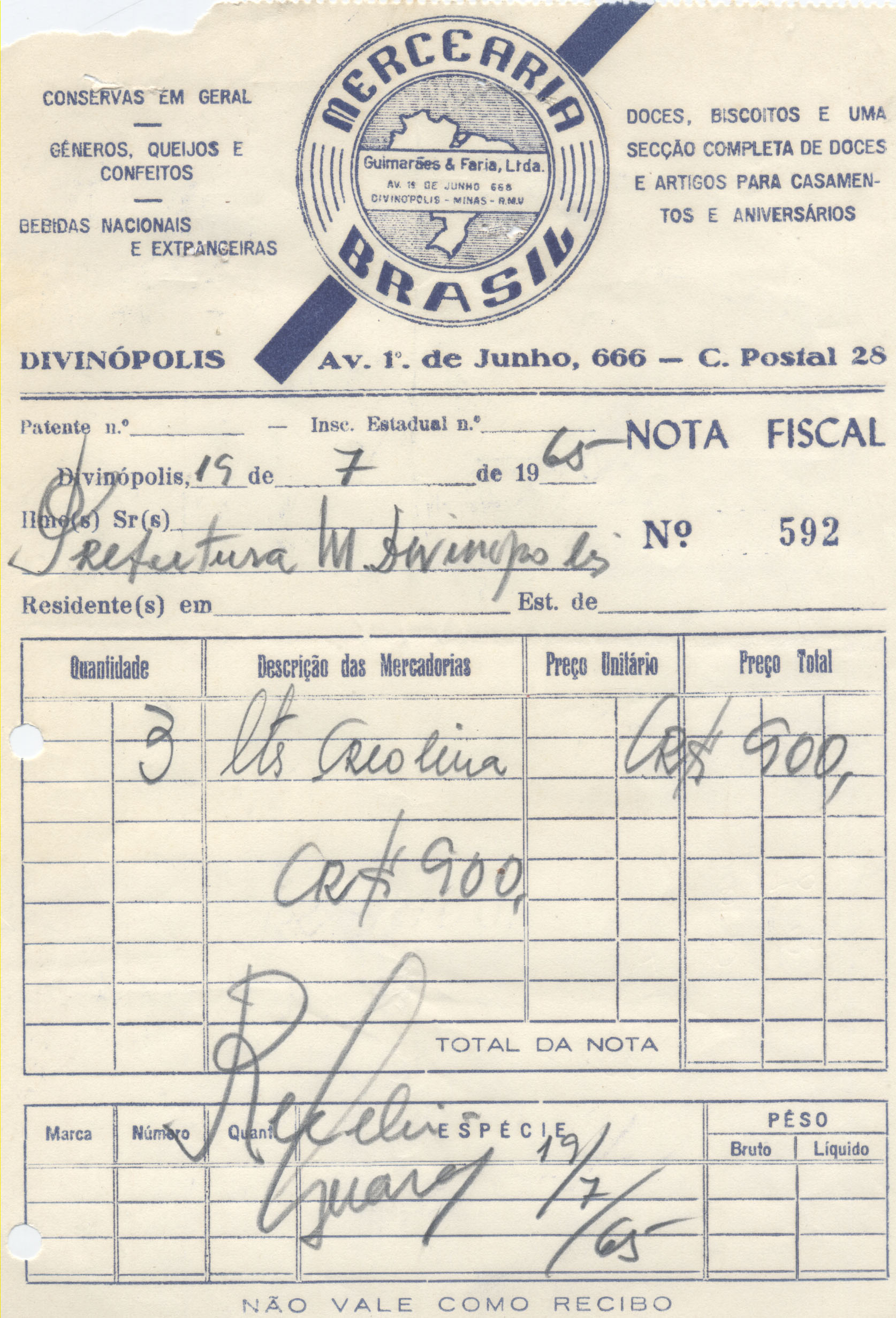 PREFEITURA MUNICIPAL DE DIVINÓPOLIS - ORDEM DE PAGAMENTO Nº 3146 CR$ 1.800,00 DISTRITO DE CIDADE DOTAÇÃO ORÇAMENTÁRIA: 3-1-4-0-03 DESPESAS IMPREVISTAS - GOVERNO E ADMINISTRAÇÃO GERAL FICA O SR. CHEFE DO SERVIÇO DE FAZENDA AUTORIZADO A PAGAR AO SR. GUIMARÃES & FARIA LTDA. A QUANTIA DE UM MIL E OITOCENTOS CRUZEIROS PROVENIENTE DE FORNECIMENTO DE CREOLINA PARA ESTAÇÃO RODOVIÁRIA. PREFEITURA MUNICIPAL DE DIVINÓPOLIS, 14 DE OUTUBRO DE 1965. RECEBI DO SR. CHEFE DO SERVIÇO DE FAZENDA, A IMPORTÂNCIA SUPRA DE UM MIL, OITOCENTOS CRUZEIROS DA QUAL PASSO O PRESENTE RECIBO EM TRIPLICATA. DIVINÓPOLIS, 14 DE OUTUBRO DE 1965.