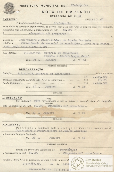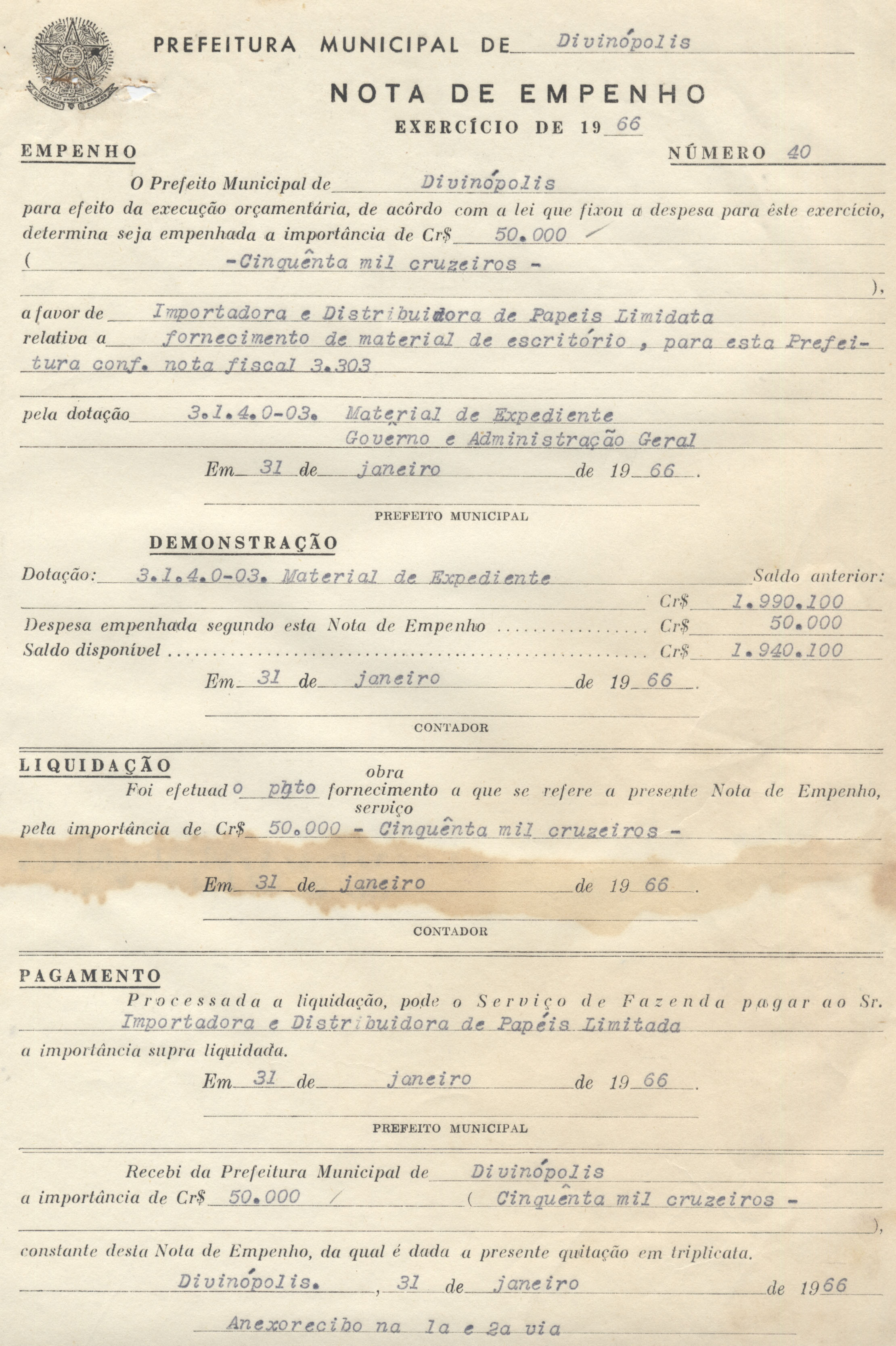 PREFEITURA MUNICIPAL DE DIVINÓPOLIS - NOTA DE EMPENHO Nº 40 CR$ 50.000,00 DOTAÇÃO ORÇAMENTÁRIA: 3-1-4-0-03 MATERIAL DE EXPEDIENTE - GOVERNO E ADMINISTRAÇÃO GERAL O PREFEITO MUNICIPAL DE DIVINÓPOLIS PARA EFEITO DA EXECUÇÃO ORÇAMENTÁRIA, DE ACORDO COM A LEI QUE FIXOU A DESPESA PARA ESTE EXERCÍCIO, DETERMINA SEJA EMPENHADA A IMPORTÂNCIA DE CR$ 50.000,00 (CINQUENTA MIL CRUZEIROS) A FAVOR DE IMPORTADORA E DISTRIBUIDORA DE PAPÉIS LIMITADA RELATIVA A FORNECIMENTO DE MATERIAL DE ESCRITÓRIO PARA ESTA PREFEITURA. EM 31 DE JANEIRO DE 1966. RECEBI DA PREFEITURA MUNICIPAL DE DIVINÓPOLIS A IMPORTÂNCIA DE CR$ 50.000,00 (CINQUENTA MIL CRUZEIROS) CONSTANTE DESTA NOTA DE EMPENHO DA QUAL É DADA A PRESENTE QUITAÇÃO EM TRIPLICATA. DIVINÓPOLIS, 31 DE JANEIRO DE 1966.