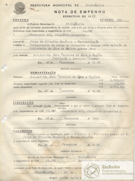 O PREFEITO MUNICIPAL DE DIVINÓPOLIS PARA EFEITO DA EXECUÇÃO ORÇAMENTÁRIA, DE ACORDO COM A LEI QUE FIXOU A DESPESA PARA ESTE EXERCÍCIO, DETERMINA SEJA EMPENHADA A IMPORTÂNCIA DE CR$ 16.050,00 (DEZESSEIS MIL E CINQUENTA CRUZEIROS) A FAVOR DEJORGE DE OLIVEIRA COMÉRCIO E REPRESENTAÇÃO RELATIVA A FORNECIMENTO DE PEÇAS DE ROLAMENTO E BUCHAS PARA ESTAÇÃO DE TRATAMENTO DE ÁGUA DO BAIRRO AFONSO PENA.