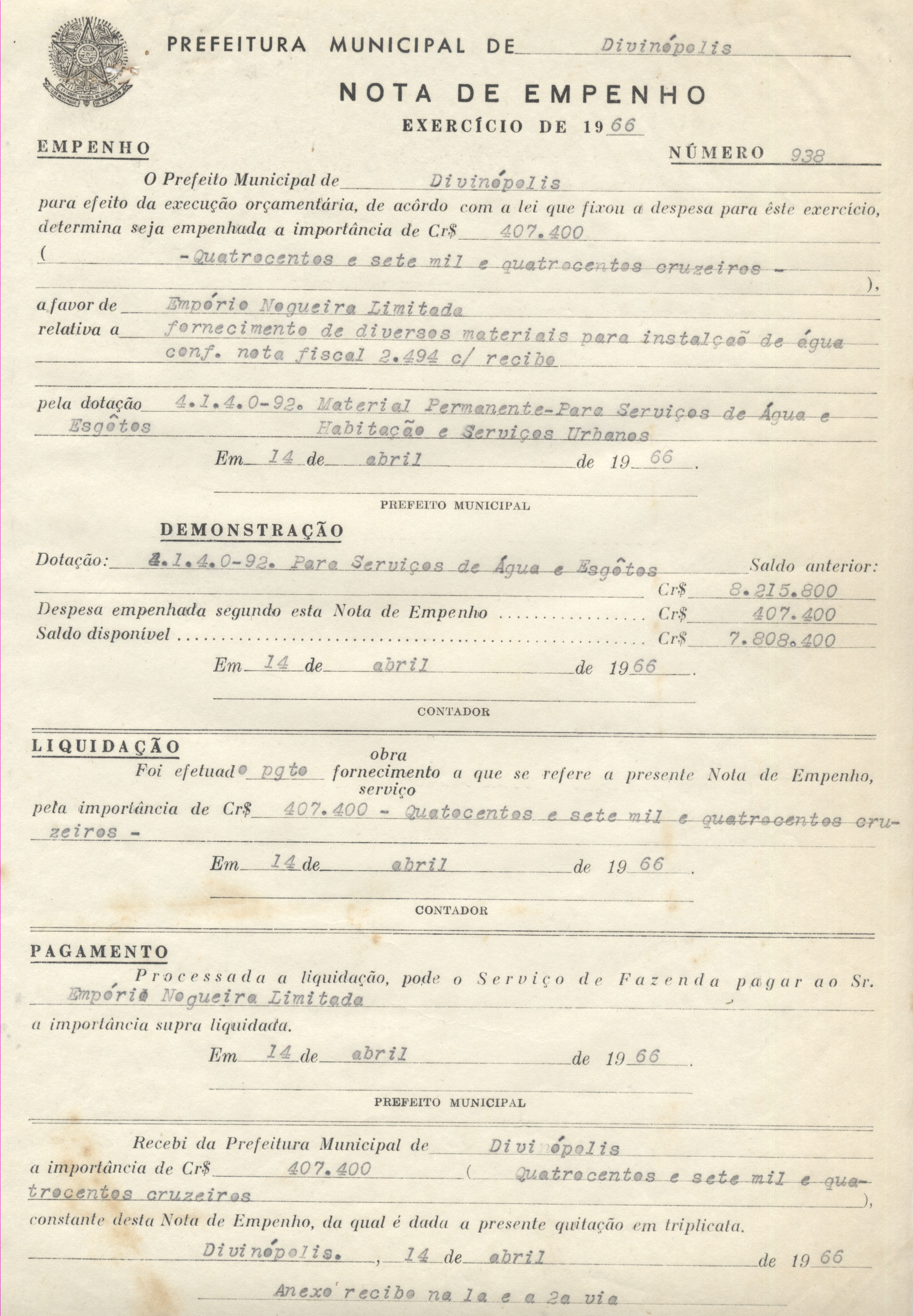 RECEBI DA PREFEITURA MUNICIPAL DE DIVINÓPOLIS A IMPORTÂNCIA DE CR$ 407.400,00 (QUATROCENTOS E SETE MIL E QUATROCENTOS CRUZEIROS) CONSTANTE DESTA NOTA DE EMPENHO, DA QUAL É DADA A PRESENTE QUITAÇÃO EM TRIPLICATA.