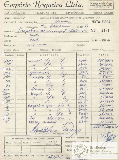 O PREFEITO MUNICIPAL DE DIVINÓPOLIS PARA EFEITO DA EXECUÇÃO ORÇAMENTÁRIA, DE ACORDO COM A LEI QUE FIXOU A DESPESA PARA ESTE EXERCÍCIO, DETERMINA SEJA EMPENHADA A IMPORTÂNCIA DE CR$ 407.400,00 (QUATROCENTOS E SETE MIL E QUATROCENTOS CRUZEIROS) A FAVOR DE EMPÓRIO NOGUEIRA LIMITADA RELATIVA A FORNECIMENTOS DE DIVERSOS MATERIAIS PARA INSTALAÇÃO DE ÁGUA PELA DOTAÇÃO 4-1-4-0-92.