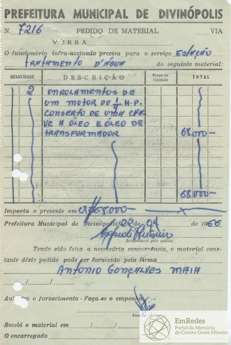 O PREFEITO MUNICIPAL DE DIVINÓPOLIS PARA EFEITO DA EXECUÇÃO ORÇAMENTÁRIA, DE ACORDO COM A LEI QUE FIXOU A DESPESA PARA ESTE EXERCÍCIO, DETERMINA SEJA EMPENHADA A IMPORTÂNCIA DE CR$ 68.000,00 (SESSENTA E OITO MIL CRUZEIROS) A FAVOR DE ANTÔNIO GONÇALVES MAIA RELATIVA A SERVIÇOS ROLAMENTO DE MOTOR E CONSERTO DE MOTOR E ÓLEO DA ESTAÇÃO DE TRATAMENTO DE ÁGUA PELA DOTAÇÃO 3-1-2-0-92