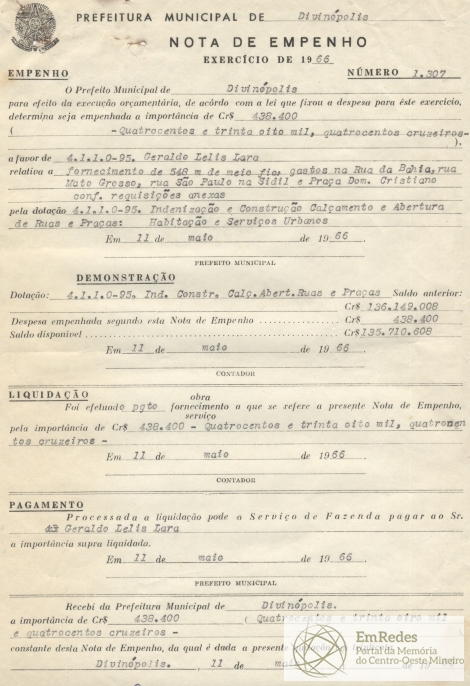 RECEBI DA PREFEITURA MUNICIPAL DE DIVINÓPOLIS A IMPORTÂNCIA DE CR$438.400,00 (QUATROCENTOS E TRINTA E OITO MIL E QUATROCENTOS CRUZEIROS) CONSTANTE DESTA NOTA DE EMPENHO, DA QUAL É DADA A PRESENTE QUITAÇÃO EM TRIPLICATA.