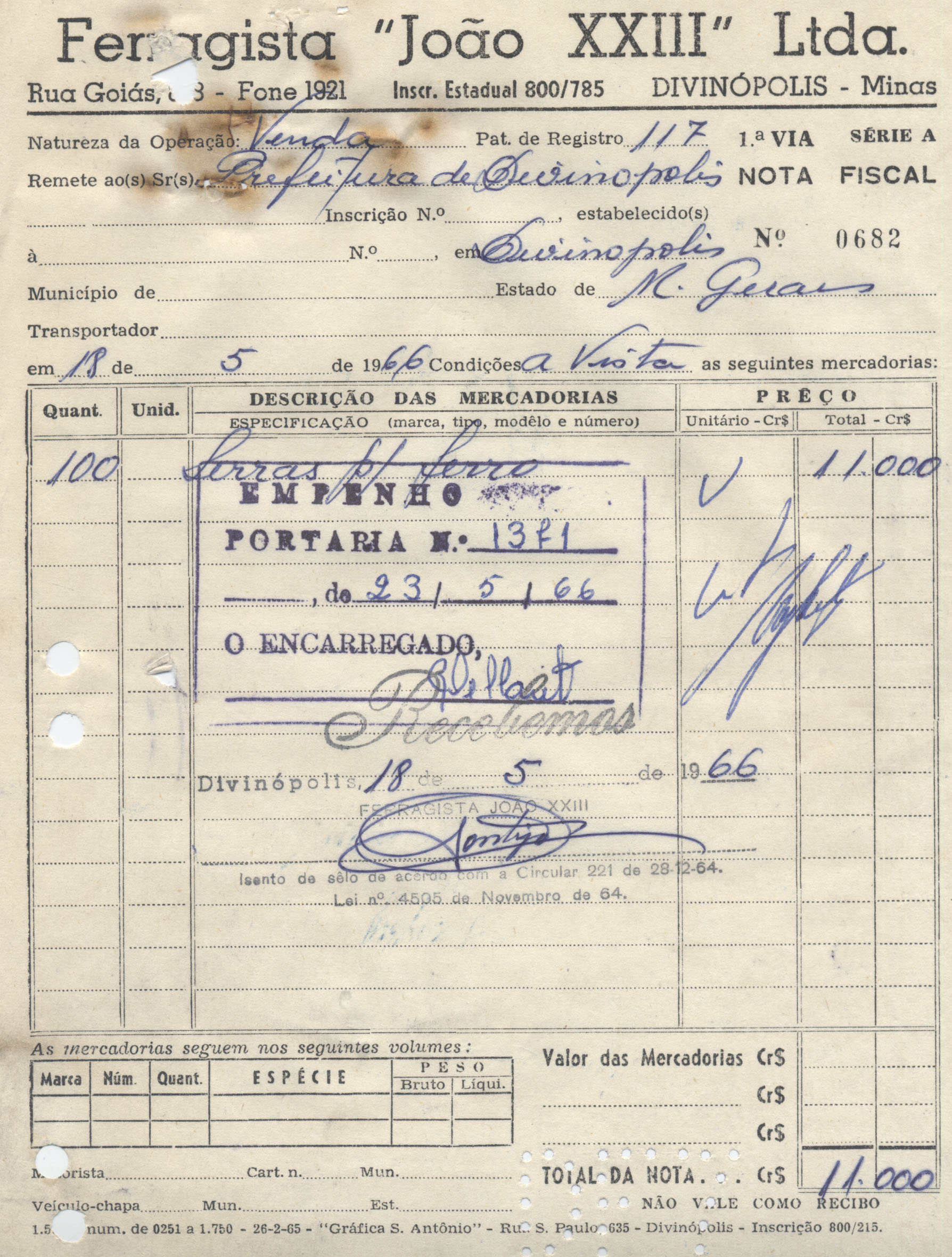 O PREFEITO MUNICIPAL DE DIVINÓPOLIS PARA EFEITO DA EXECUÇÃO EXTRAORÇAMENTÁRIA, DE ACORDO COM A LEI QUE FIXOU A DESPESA PARA ESTE EXERCÍCIO DETERMINA SEJA EMPENHADA A IMPORTÂNCIA DECR$11.000,00 (ONZE MIL CRUZEIROS) A FAVOR DE FERRAGISTA JOÃO XXIIILTDA. RELATIVA A FORNECIMENTO DE 100 SERRAS PARA FERRO GASTOS COM INSTALAÇÃO DE ÁGUA PELA DOTAÇÃO 3-1-2-0-92.