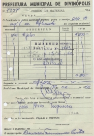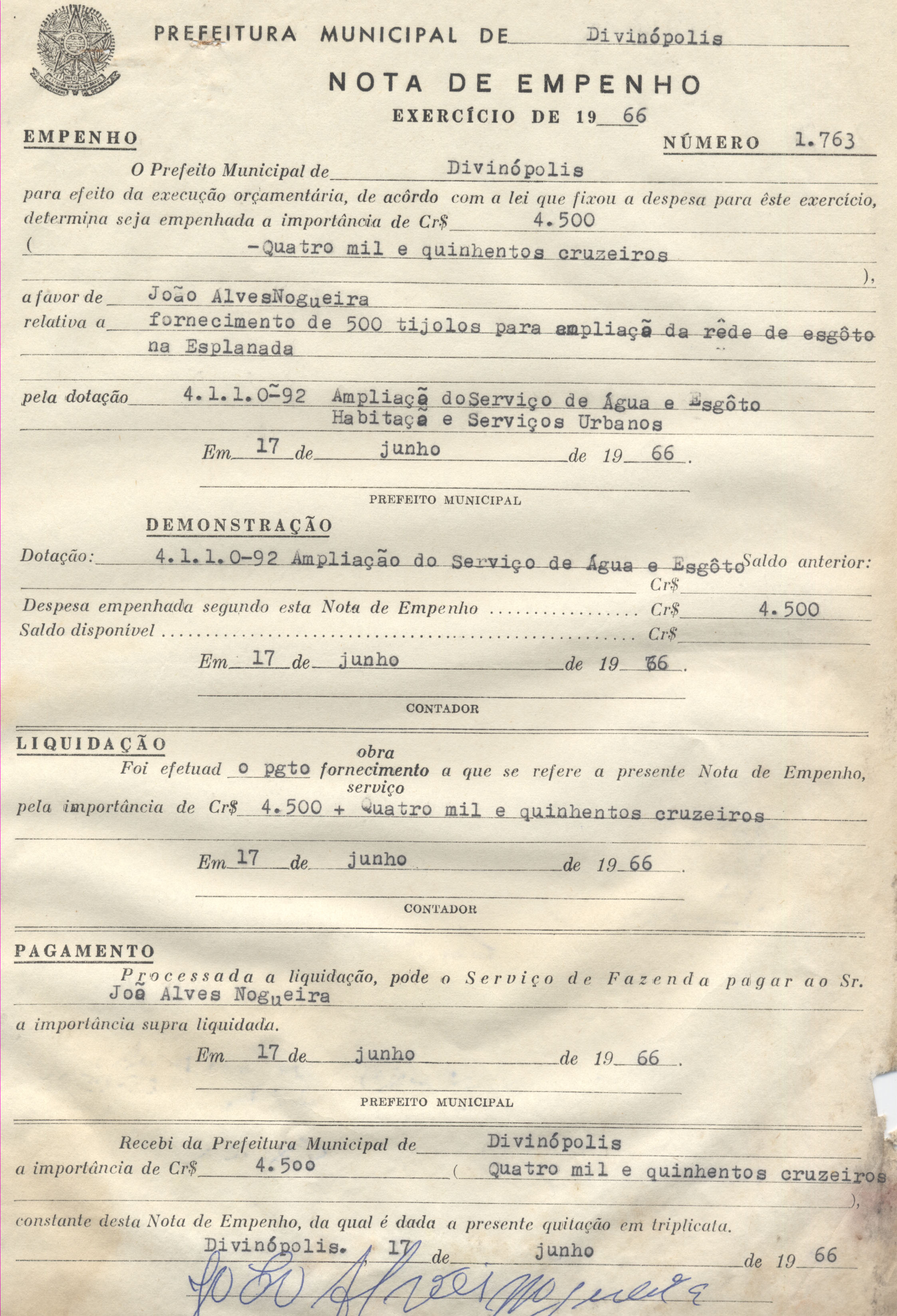 RECEBI DA PREFEITURA MUNICIPAL DE DIVINÓPOLIS A IMPORTÂNCIA DE CR$4.500,00 (QUATRO MIL E QUINHENTOS CRUZEIROS) CONSTANTE DESTA NOTA DE EMPENHO, DA QUAL É DADA A PRESENTE QUITAÇÃO EM TRIPLICATA.
